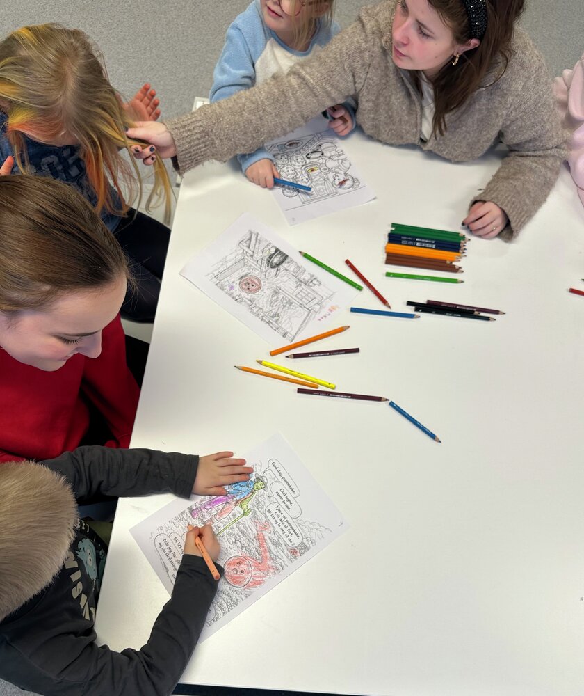 Til slutt hadde de eventyrstund knyttet til fortellingen om Pannekaka. Barna fargela illustrasjoner fra eventyret, og tegningene ble brukt aktivt da elevene fremførte eventyrstunden.