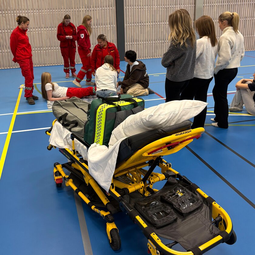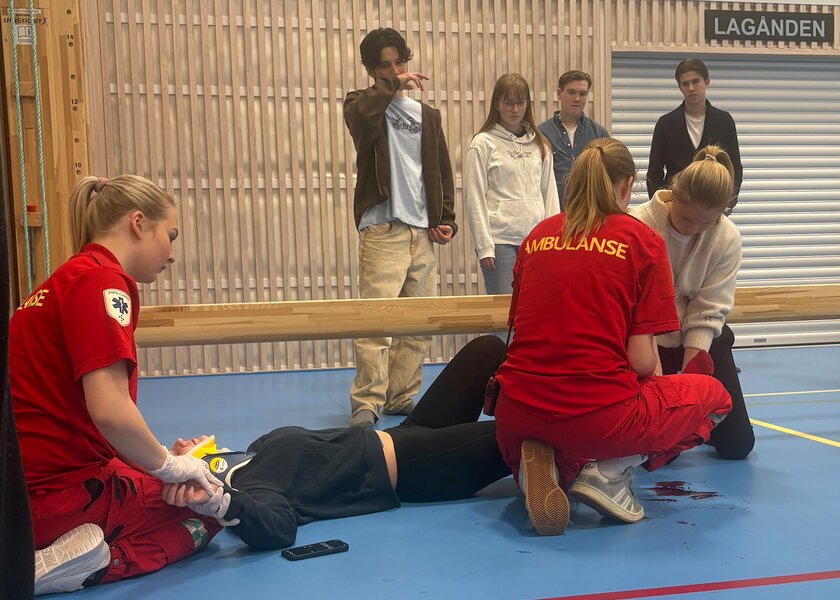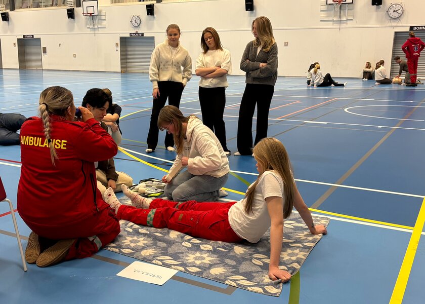 Uka etter hadde vi et praktisk opplegg i hallen hvor elevene fikk øve praktisk på det de hadde lært uka før. Der møtte de tre ulike scenarioer hvor de fikk prøve seg på flere førstehjelps-prinsipper.